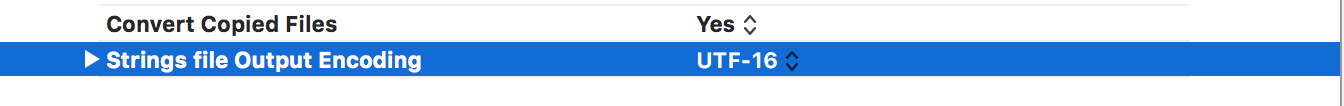 Note: It is recommended that you save strings files using the UTF-16 encoding, which is the default encoding for standard strings files. It is possible to create strings files using other property-list formats, including binary property-list formats and XML formats that use the UTF-8 encoding, but doing so is not recommended. Apple String resource documentation
