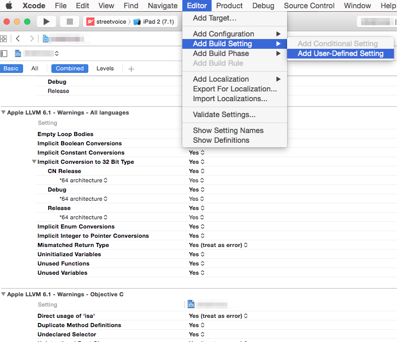 Go to your project’s build settings, select Editor -> Add Build Setting -> Add User-Defined Settings.